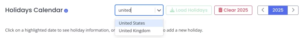 The image below shows how easy it is to load a list of holidays for a country.