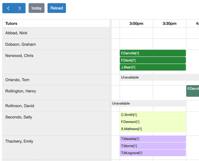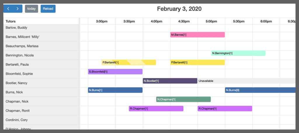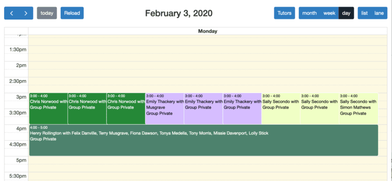 Switching to the Tutor-Lane view of the calendar I see the same information but presented per tutor.