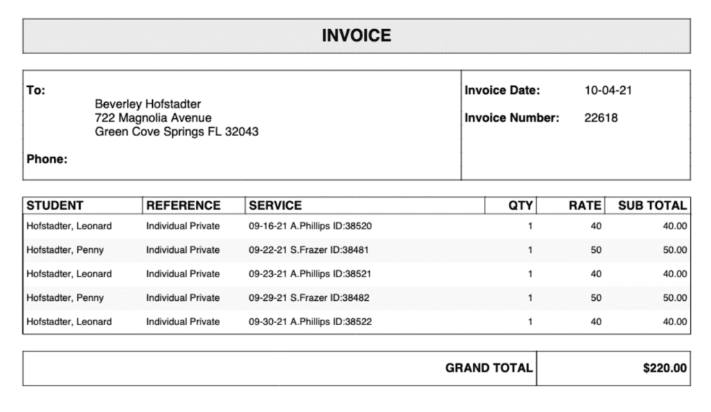 Private Individual Tutoring Invoicing